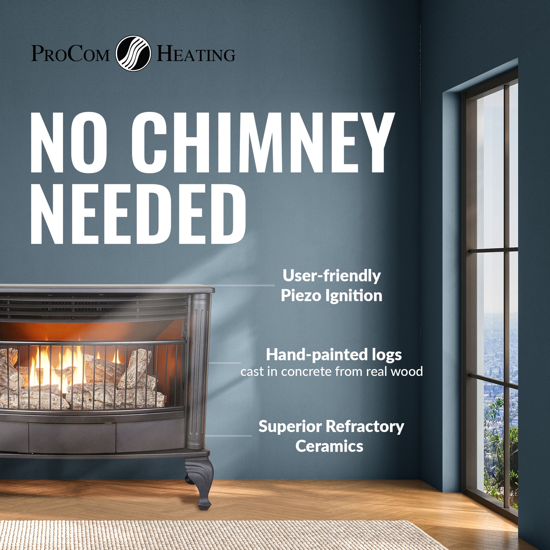 • Ventless indoor gas fireplace features 25,000 BTUs, heating up to 1,100 square feet for a warm, cozy home any time of year