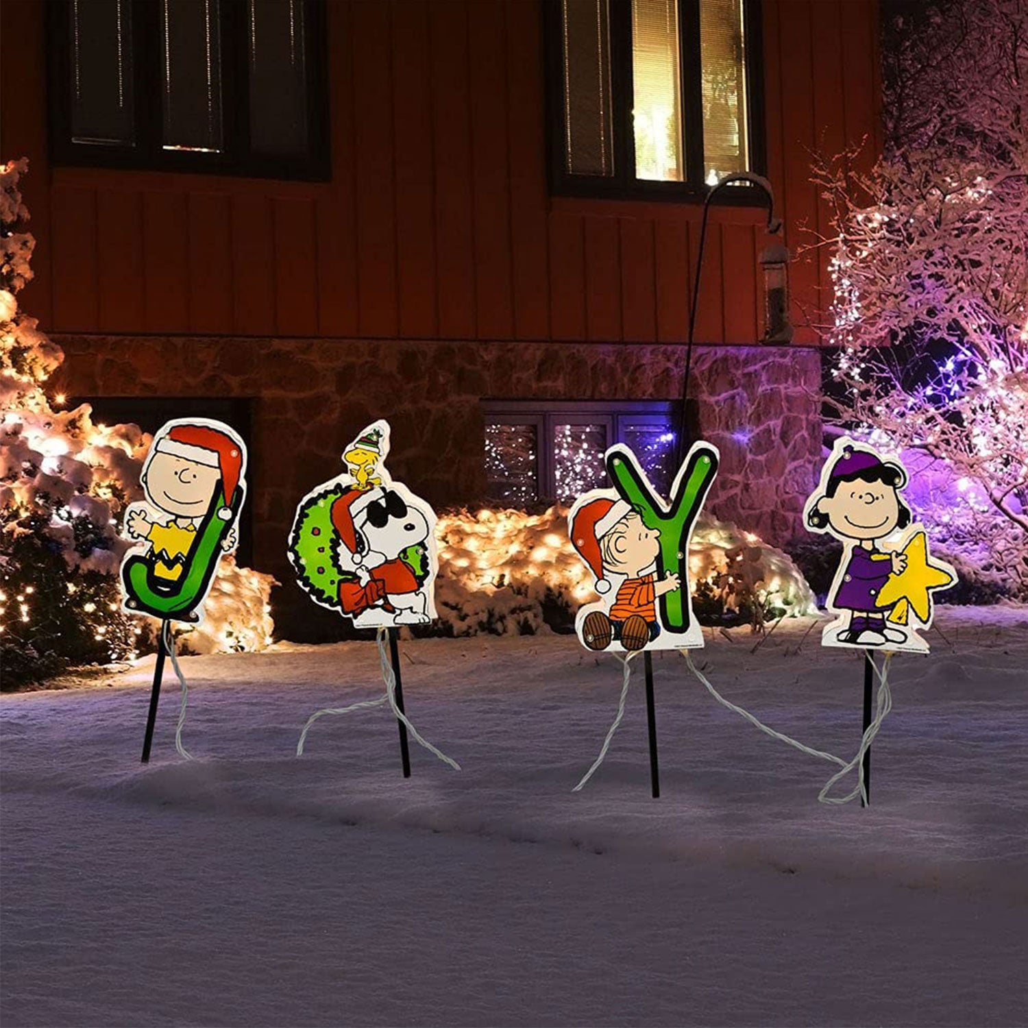 This set of yard stakes features Charlie Brown, Snoopy, Woodstock, Linus, and Lucy from the classic Peanuts animations. Follow these beloved figures as they spell out the word "Joy." Internally pre-lit, these 8-inch decorations can be connected to 14-inch stakes with 25 clear mini lights that will illuminate your lawn with festive fun. To bring this holiday decoration to life, you can either stick them in the ground or hang them indoors with the suction cup hangers.