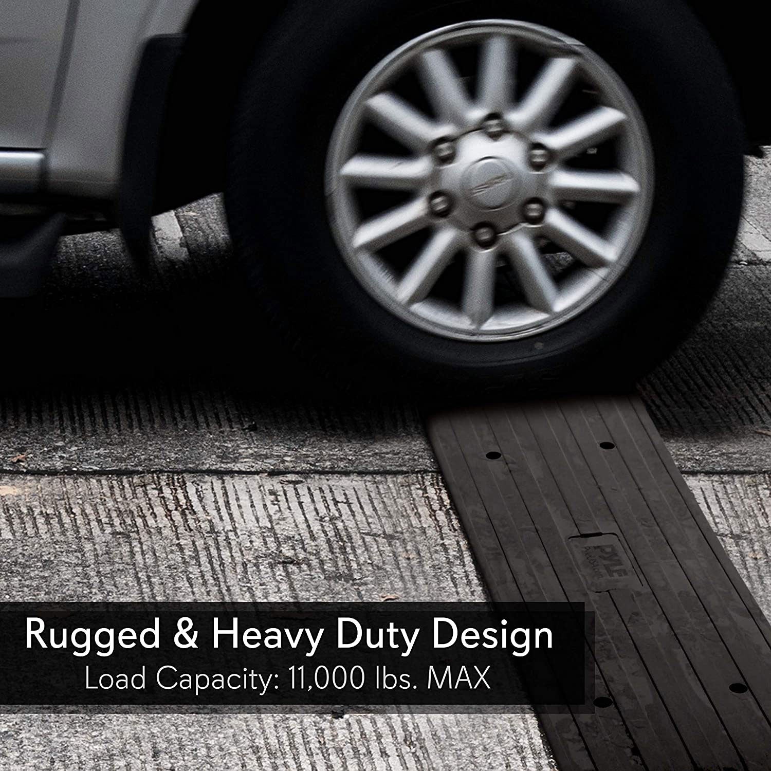 Easily overcome un-even curbs, driveways, gutters, garages, sidewalks, and more with the Pyle Car/Truck Curbside Driveway Ramp. This driveway curb ramp features a threshold bridge track style, which is designed to create smooth inclines on curbs. This package includes 2 tracks pieces, each measuring 4 feet long, 16 inches wide, and 2.6 inches high. Each piece of car ramp track supports up to 11,000 pounds (additional pieces do not increase overall weight capacity). These car ramp track pieces are most suitable for curbs measuring about 20 inches from base to peak, and 1.75 to 3 inches deep. Use the curbside driveway ramp anywhere. These car ramps feature a versatile design that works for cars, trucks, trailers, RVs, forklifts, scooters, bikes, and wheelchairs in indoor and outdoor environments at home or at offices and businesses. The heavy-duty vehicle curbside ramp has a textured surface for increased friction and traction on steep or uneven surfaces. Made of marine-grade, waterproof rubber, the curbside bridge ramp can be left out in the elements. Create a smoother ride with the Pyle Car/Truck Curbside Driveway Ramp.