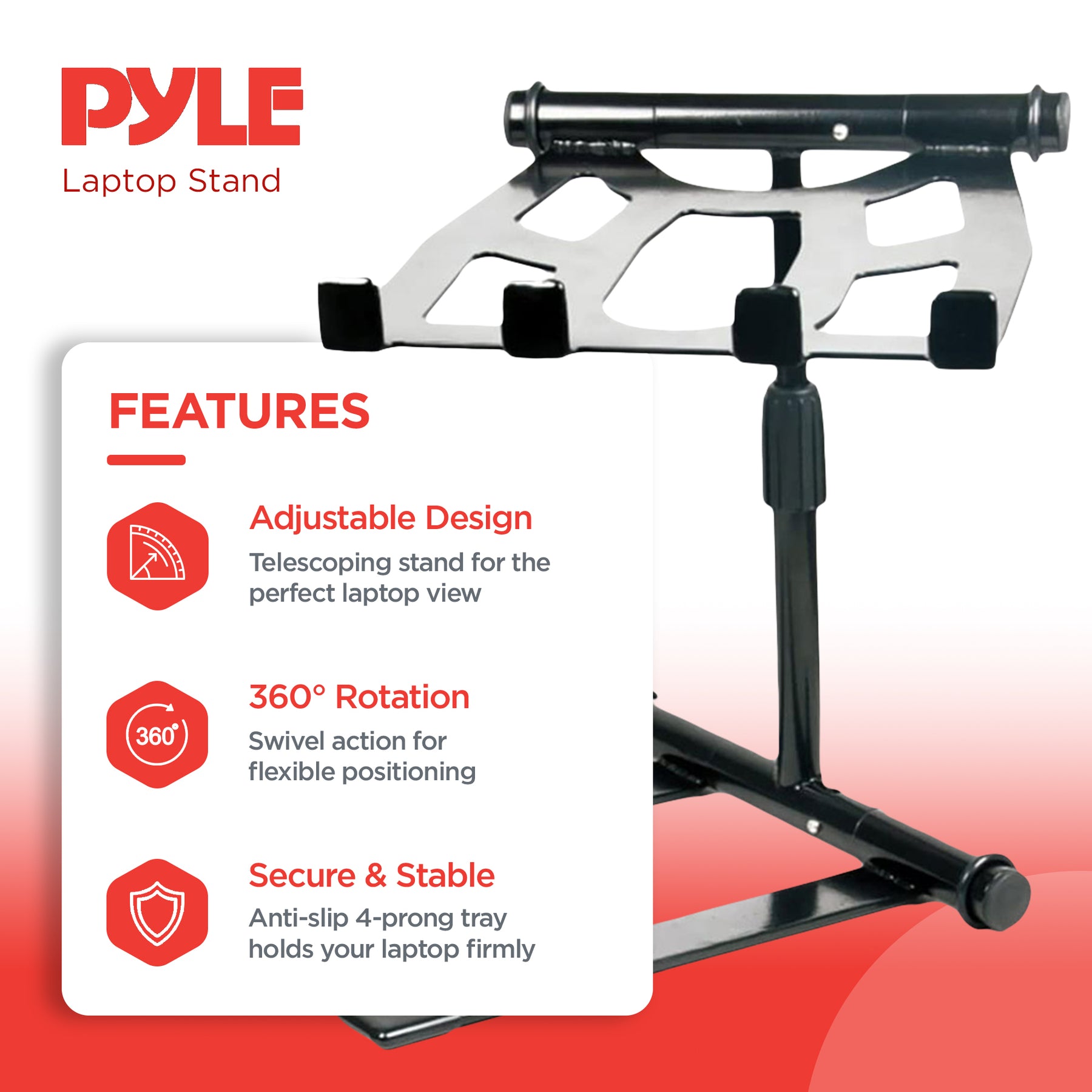 The laptop stand features an adjustable telescoping design so you can find the perfect viewing experience. The computer holder also features a 360-degree swivel rotation action that allows for flexibility when finding that ideal rhythm as you move around the booth to get the crowd going. Know your equipment is safe and secure, as the stand features a 4-prong anti-slip tray that ensures the utmost stability.
