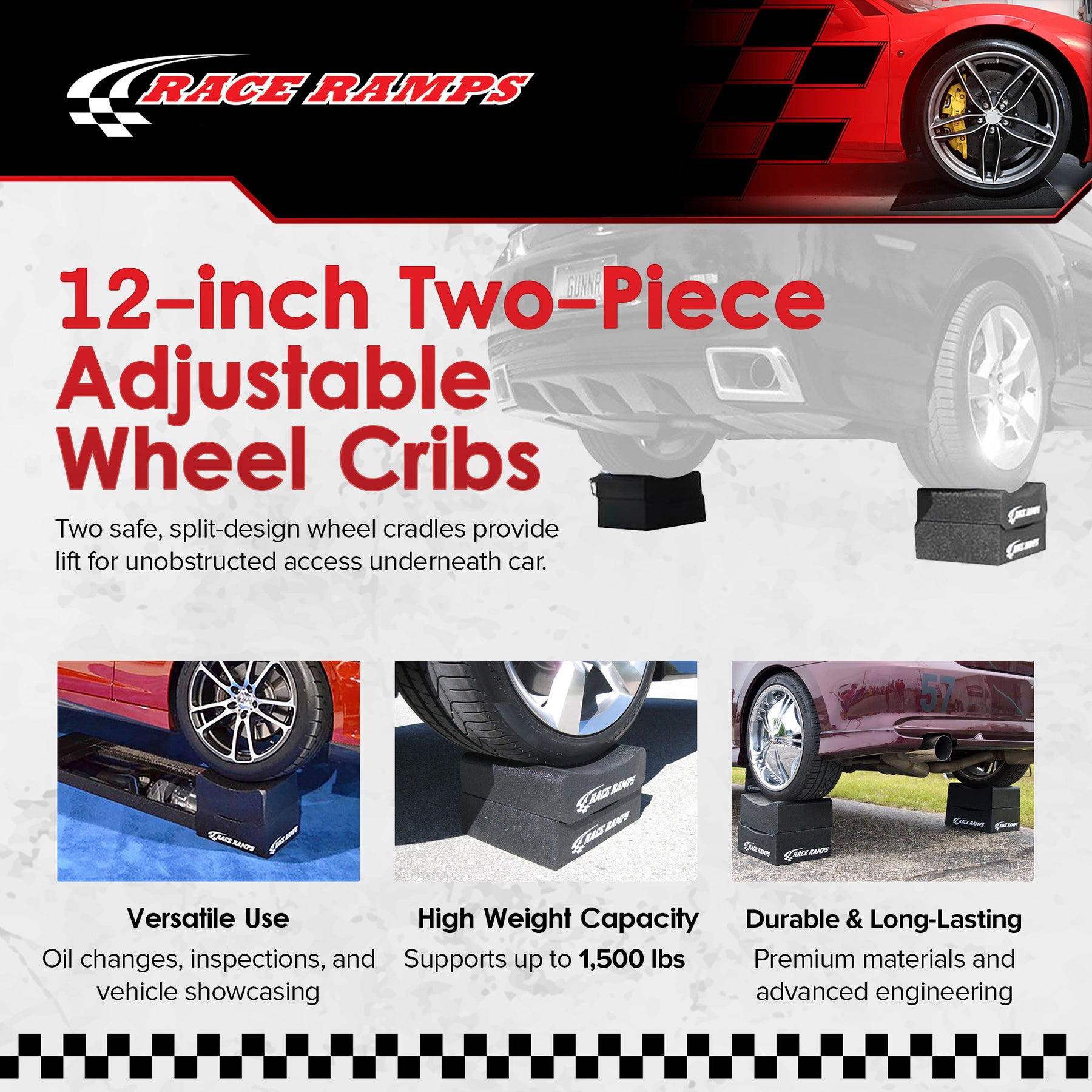 • Our 12-inch Adjustable Wheel Cribs prevent scratches and marks on any surface, ensuring your garage stays pristine