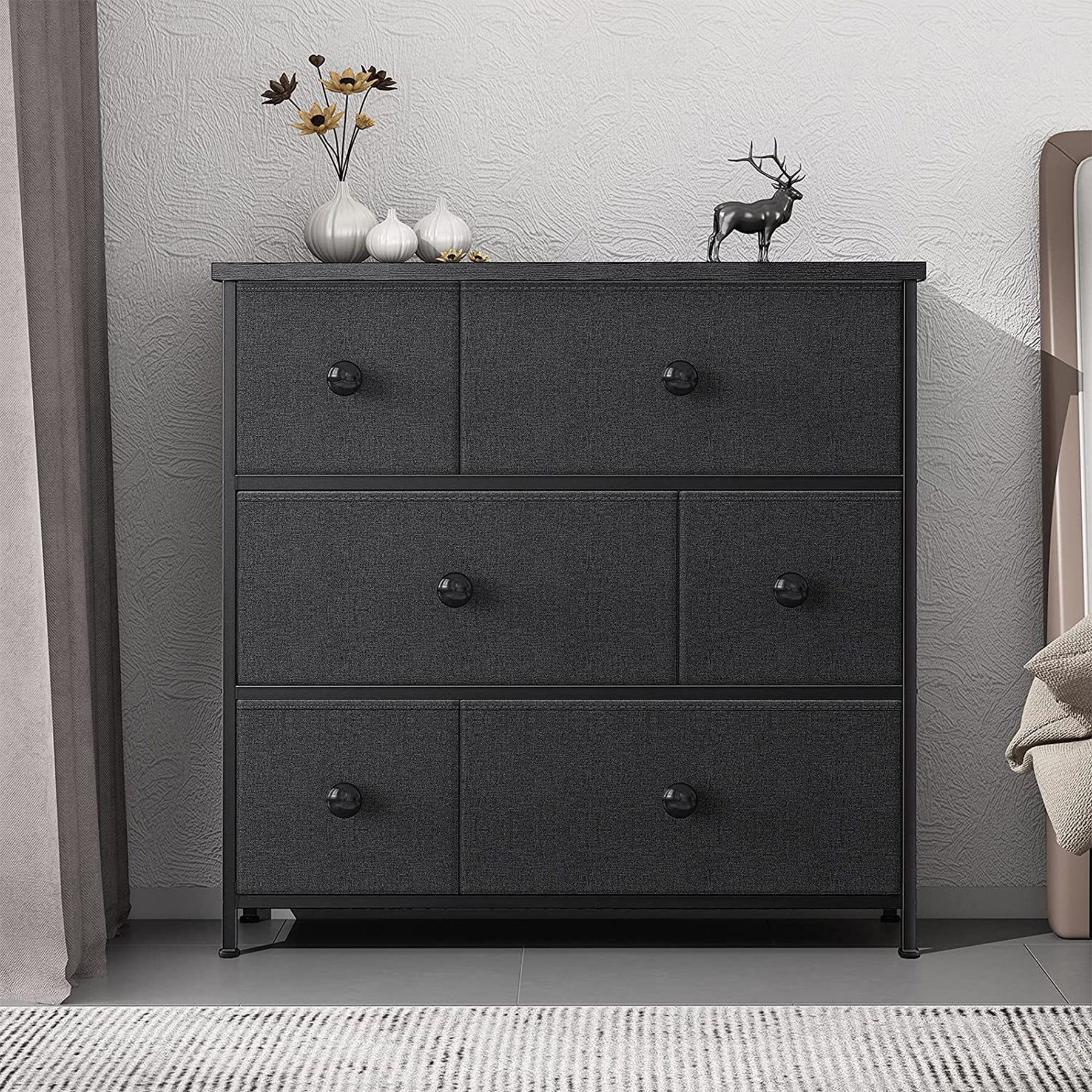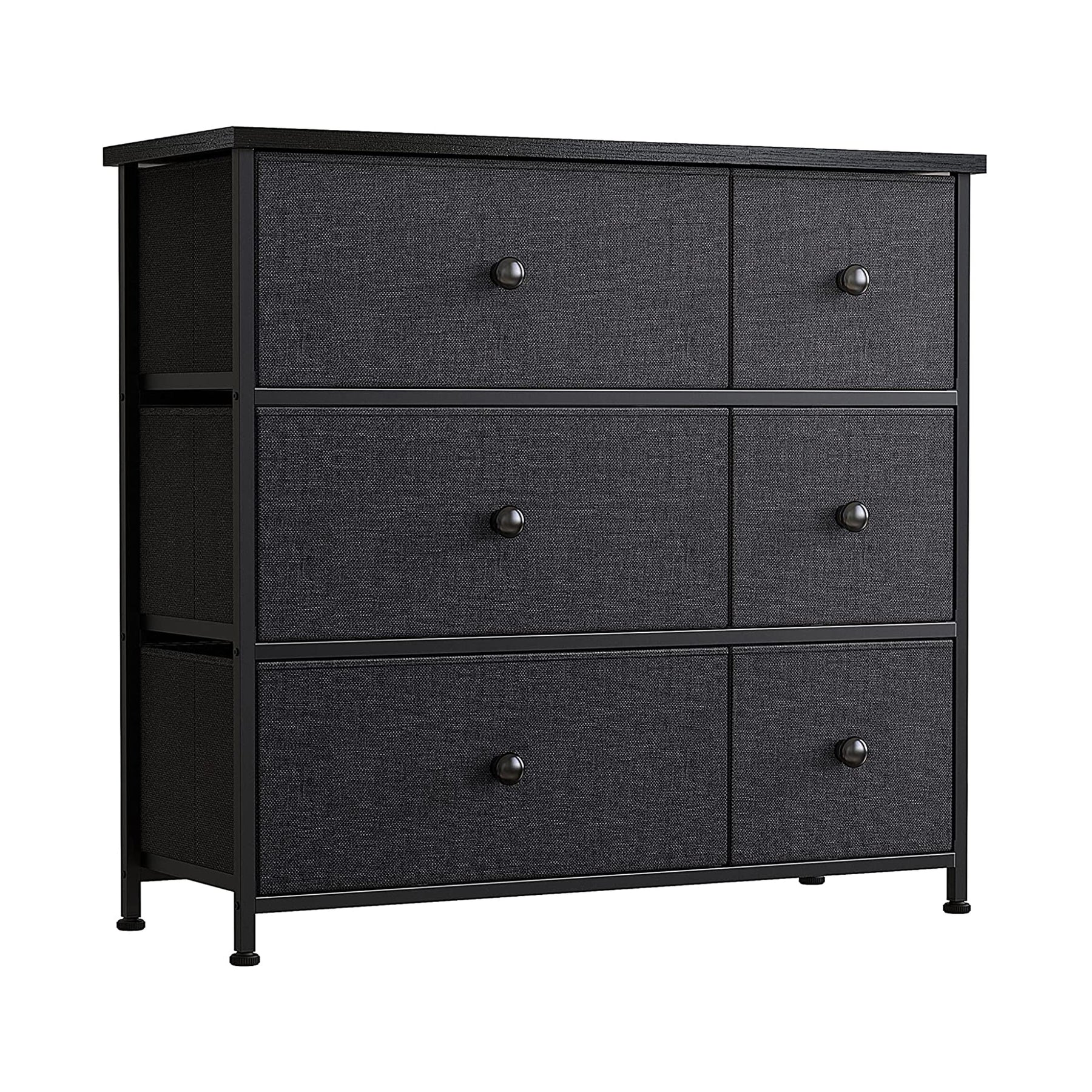 With 6 drawers, 3 small and 3 big, this minimalist-designed storage chest provides all the room you need to store anything from clothes to home goods. The steel frame, wooden countertop, and fabric drawers provide a sturdy structure made from reliable materials. Adorn the top 31.4-inch waterproof surface with your favorite decor items. The adjustable feet and wall attachment add a level of increased safety, especially if you have climbing pets or kiddos.