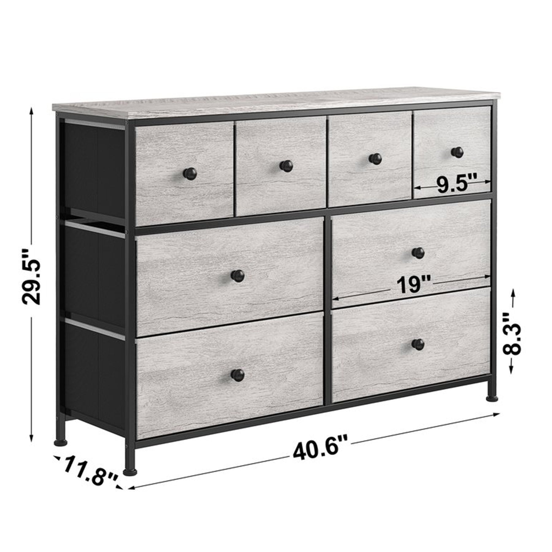 With 8 drawers, 4 small and 4 big, this minimalist-designed storage chest provides all the room you need to store anything from clothes to home goods. The steel frame, wooden countertop, and fabric drawers provide a sturdy structure made from reliable materials. Adorn the top 40.60-inch waterproof surface with your favorite decor items. The adjustable feet and wall attachment add a level of increased safety.