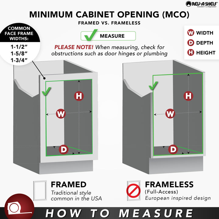 Double check your cabinet's opening to allow the best fit. Measure side to side, front to back, and top to bottom. Double check to make sure your product is within measurements and don't forget to take into account any obstructions.