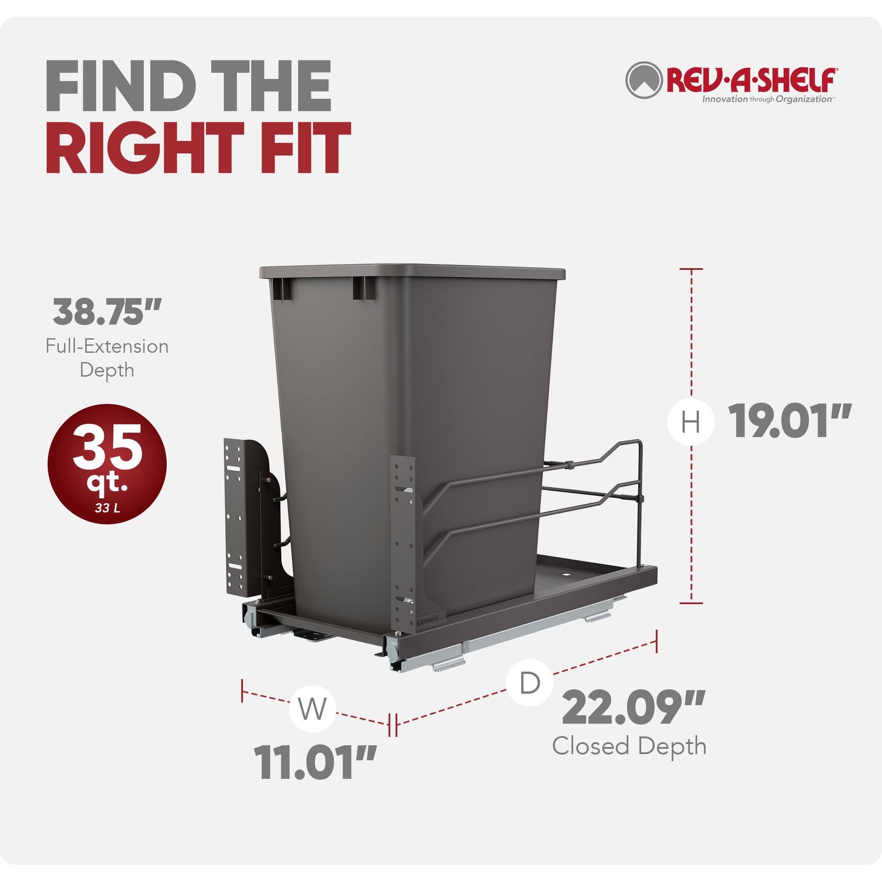 Double check your cabinet's opening (inside dimensions) to allow the best fit. Measure side to side (width), front to back (depth or length), and top to bottom (height). Double check to make sure your product is within measurements and don't forget to take into account any obstructions (plumbing, hinges, etc.). Enjoy a spacious, functional kitchen, thanks to this Rev-A-Shelf Pullout Trash Bin.