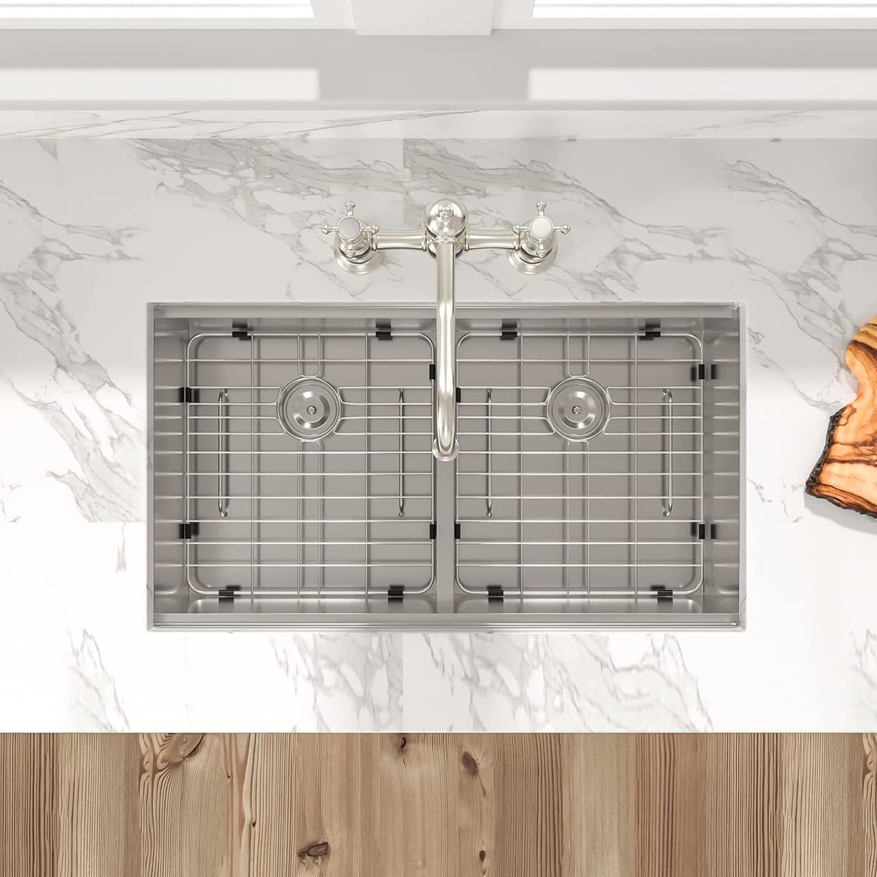 • Includes sink, stainless steel grate, redwood cutting board, colander, roll-up metal dish dry rack, drain assembly, mounting clips, and installation guide