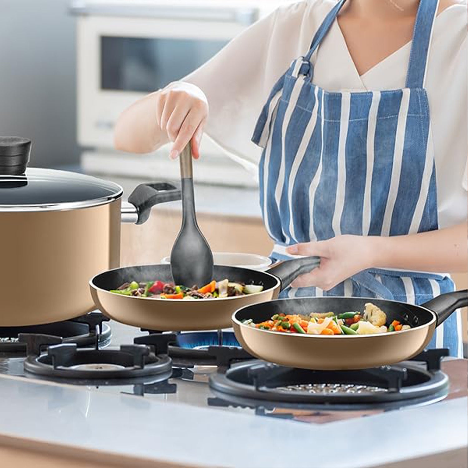 • Comes with multiple sizes of sauce pots, fry pans, a dutch oven pot with a lid, a solid spoon, slotted spatula, and soup ladle