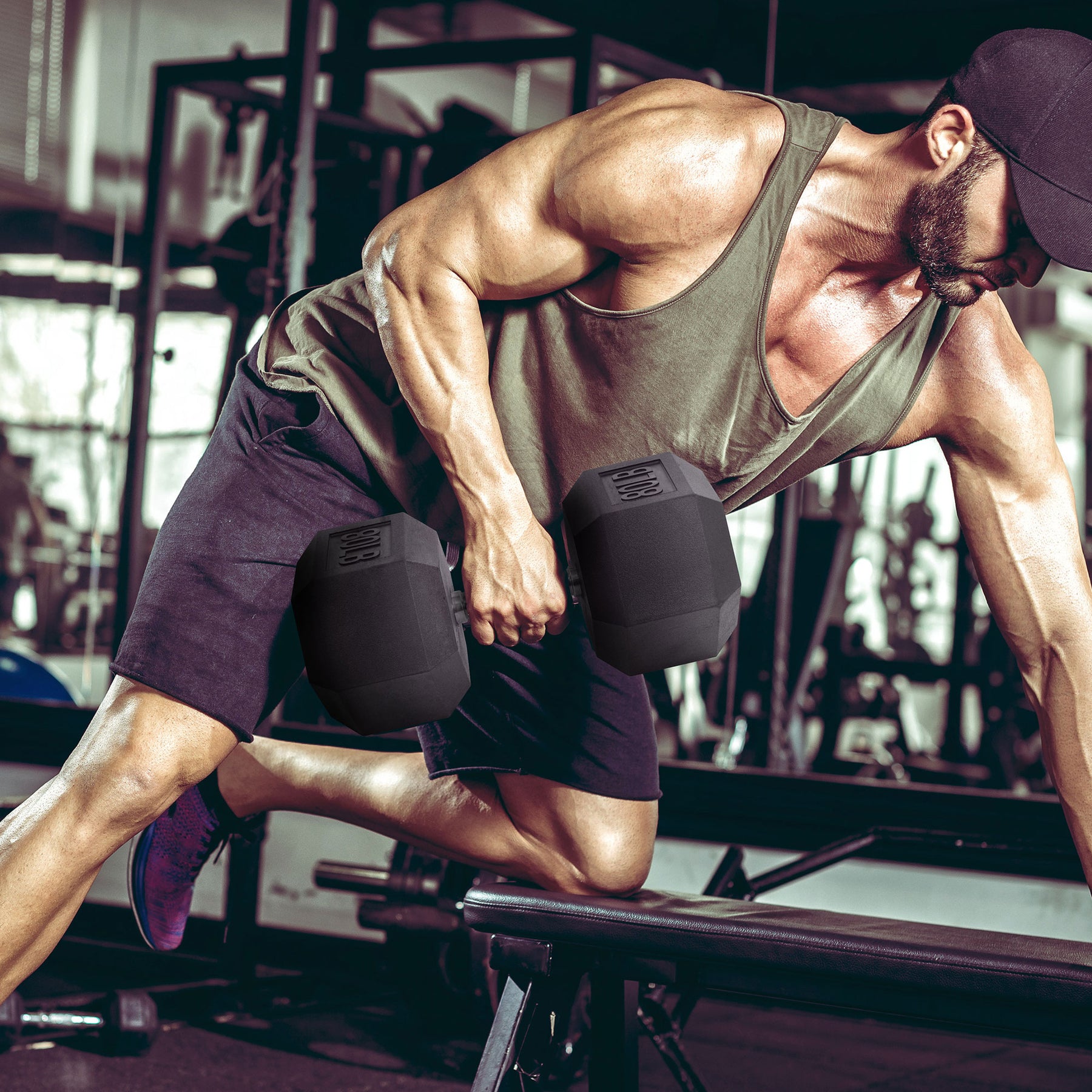 • Hexagon-shaped dumbbell head prevents the free-hand weight from rolling away during rest breaks