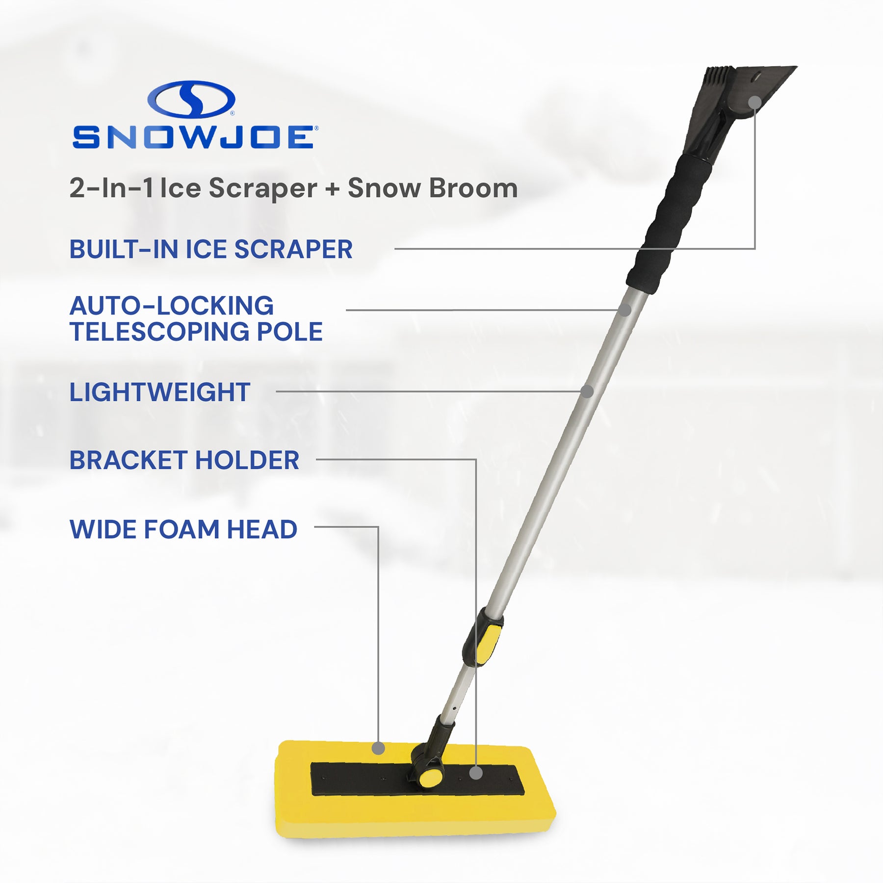Clear snow faster, safer, and more comfortably with the Snow Joe 2-in-1 Telescoping Snow Broom and Ice Scraper, the ultimate winter tool for cars, trucks, SUVs, and more. Designed to handle heavy, wet snow and stubborn ice, this versatile tool combines a wide, non-abrasive foam broom head with a built-in ice scraper, giving you everything you need for fast, efficient winter cleanup.