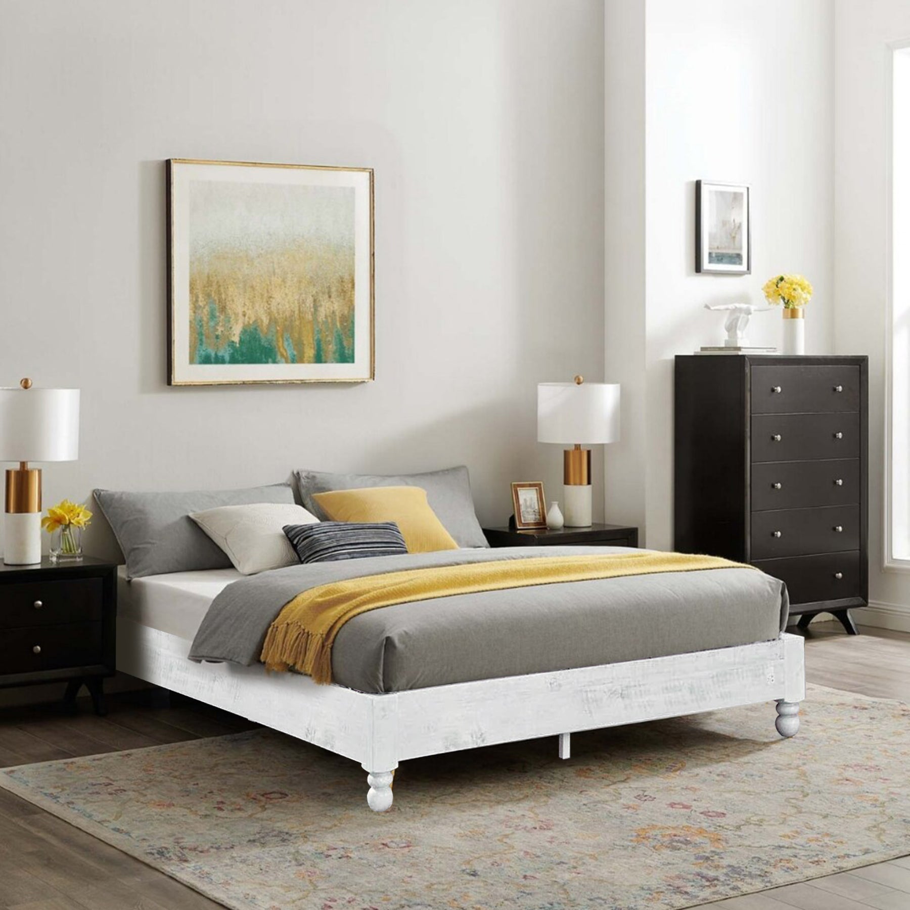 • King-size platform bed frame adds a dash of rustic appeal to your bedroom decor