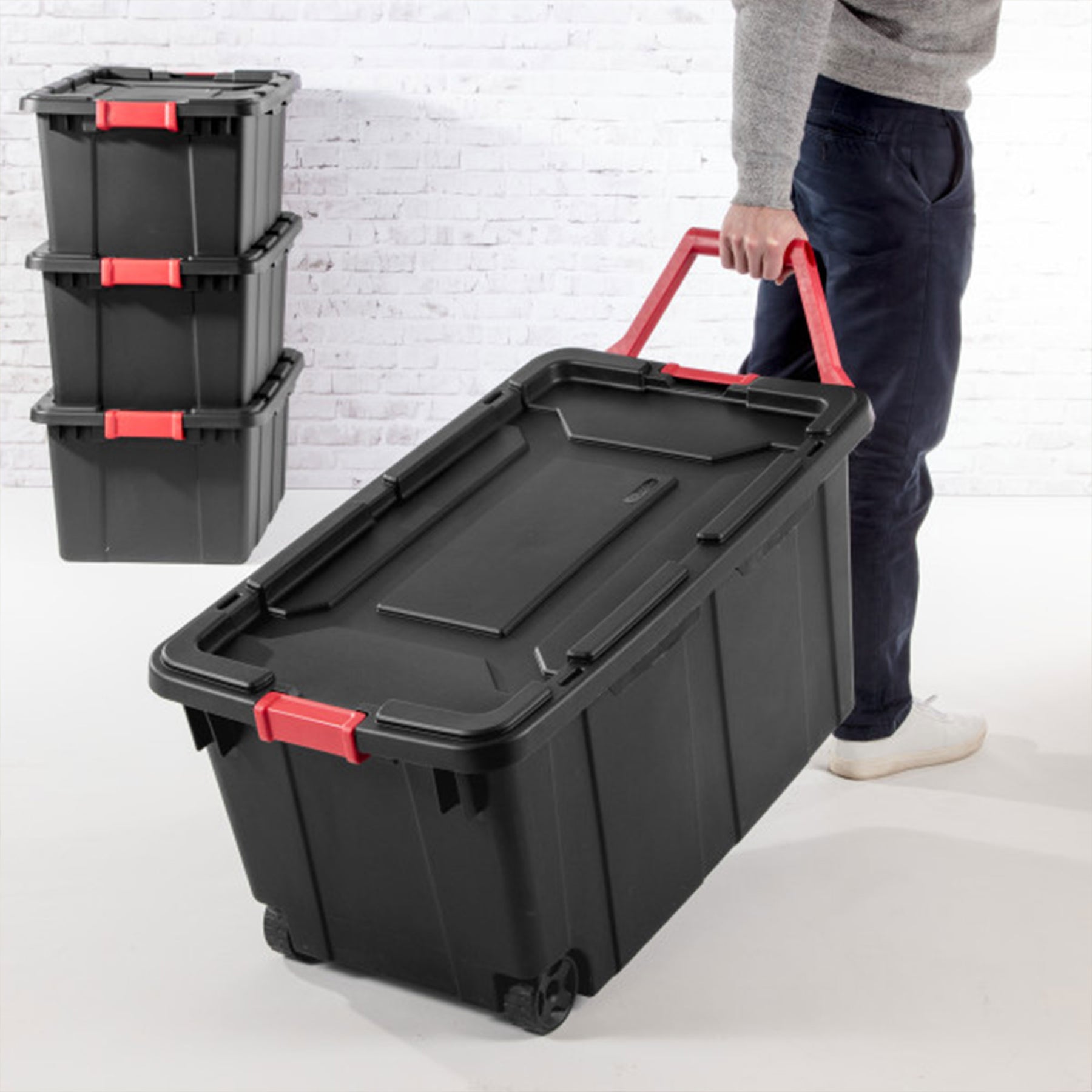 The tight-fit, drip-protected lid provides maximum protection against items getting wet. Deep recessed lids allow for secure stacking to maximize available storage space. Keyholes in the lid provide options for tie-downs to keep totes in place when transporting and storing. The rugged black totes feature an exciting red latch that helps you easily identify where to open the totes.