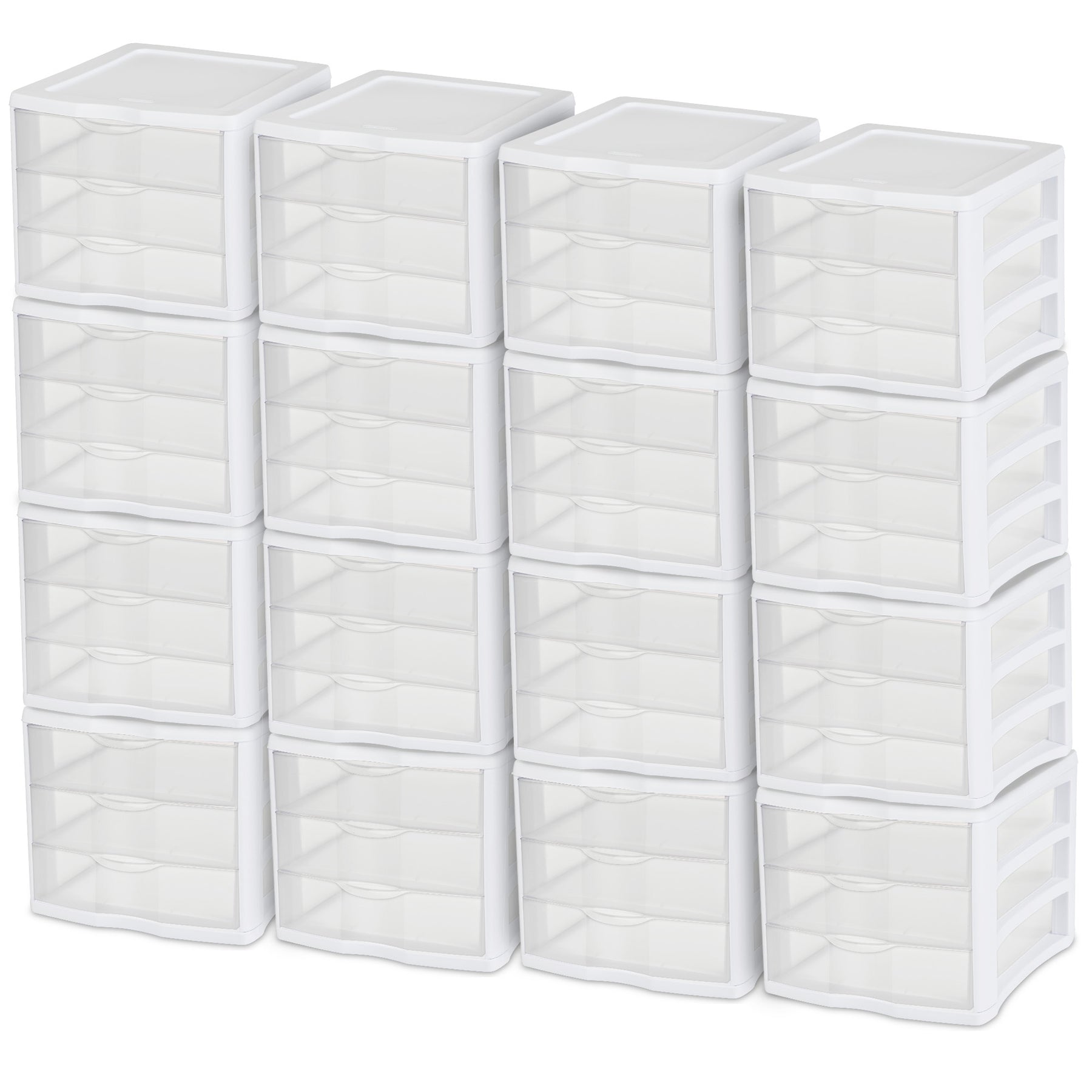 This small storage unit is ideal for offices, bedrooms, bathrooms, and dorms. Maximize your storage space with the Sterilite ClearView Plastic Stacking 3-Drawer Storage Organizer System, (16-Pack).