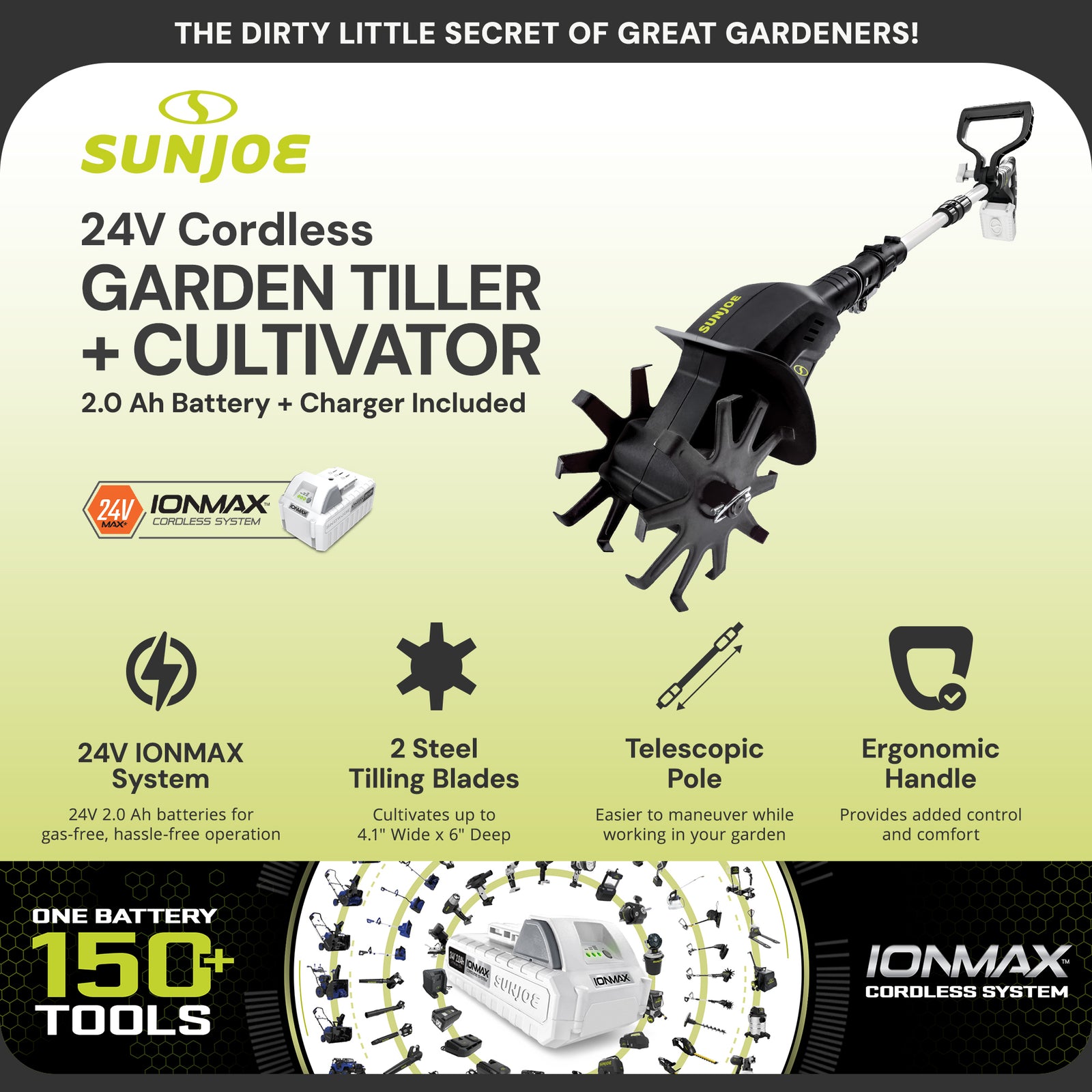 - Runs on a 24V 2.0 Ah lithium-ion battery for gas-free, no-fade performance—perfect for hassle-free gardening anywhere