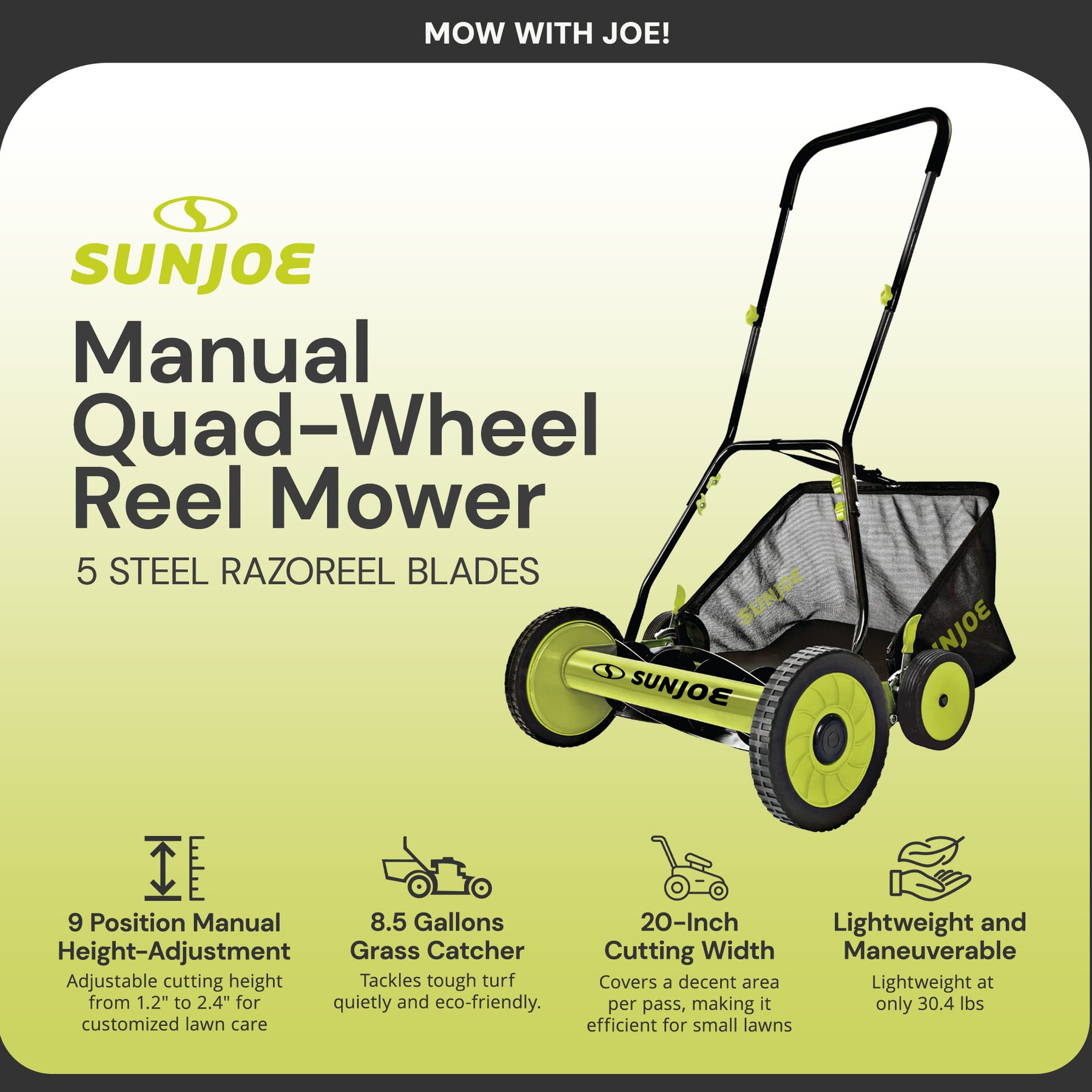 - The Sun Joe mower features a 20-inch wide cutting path with 5 durable steel blades, ensuring a clean, precise cut through grass with its superior cutting efficiency