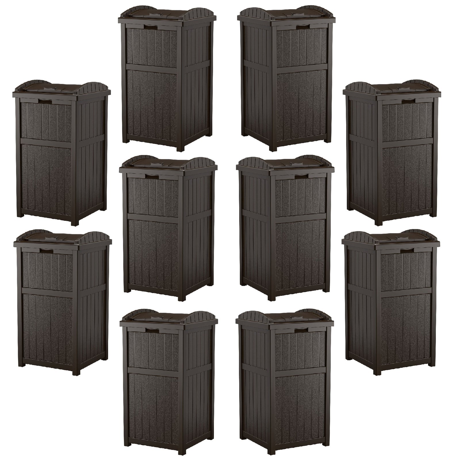 Hide your trash in this stylish outdoor 10-pack of Suncast Trash Hideaway Outdoor Patio 33-Gallon Trash Cans.