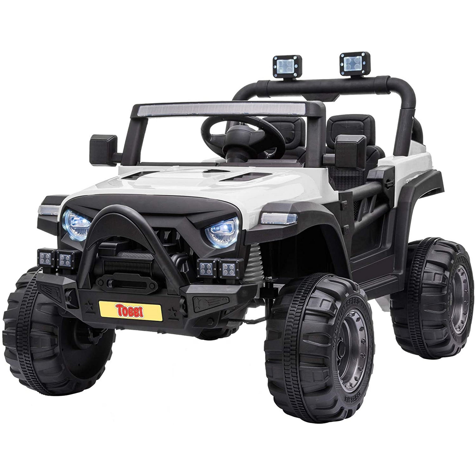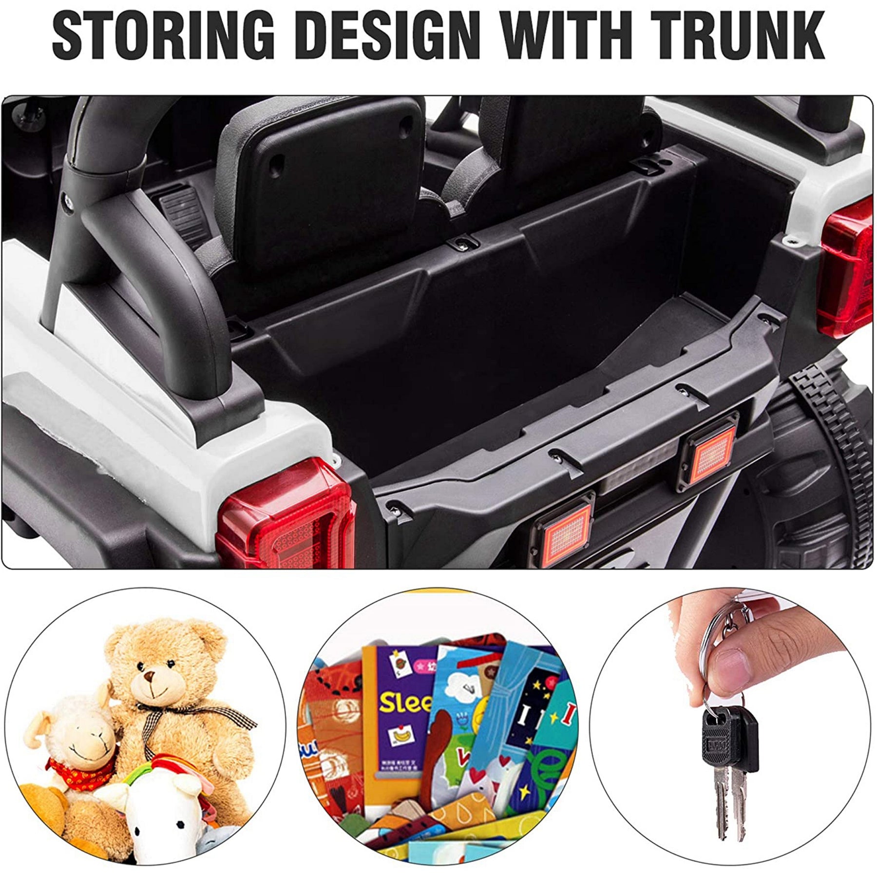 - Advanced kids' ride-on car comes with distinctive grille, roll bars, two open doors with lock, front and back fenders, rear luggage box, and realistic bodywork details