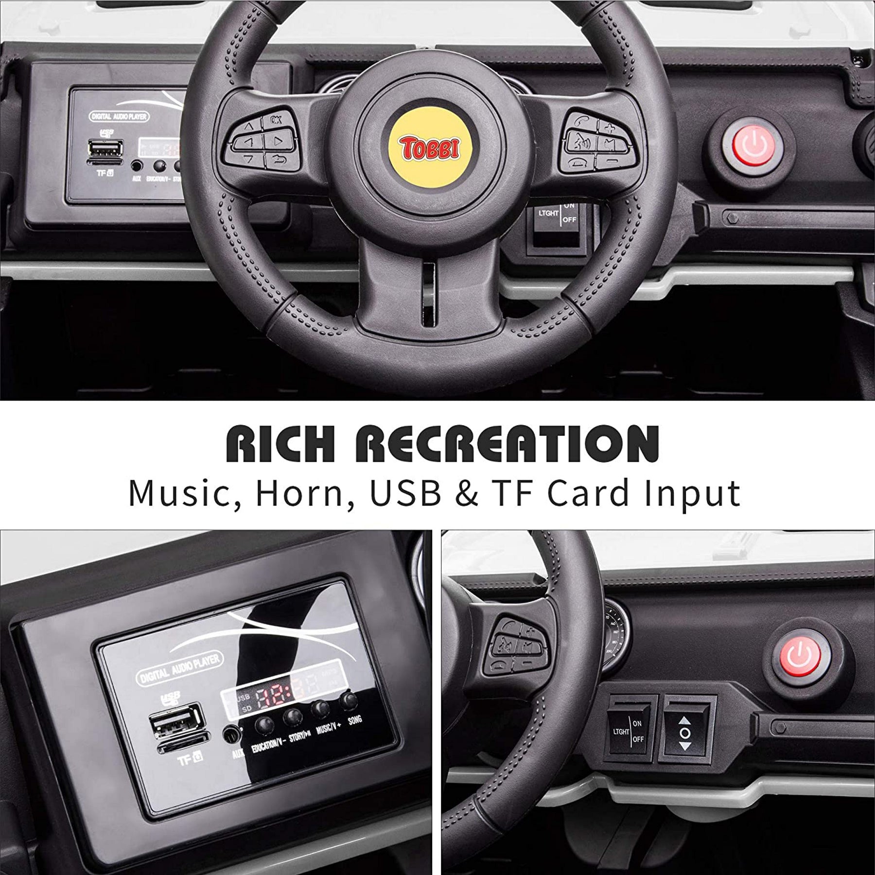 - Equipped with MP3 player, USB port, TF card slot, volume adjustment, and realistic engine sound for fun