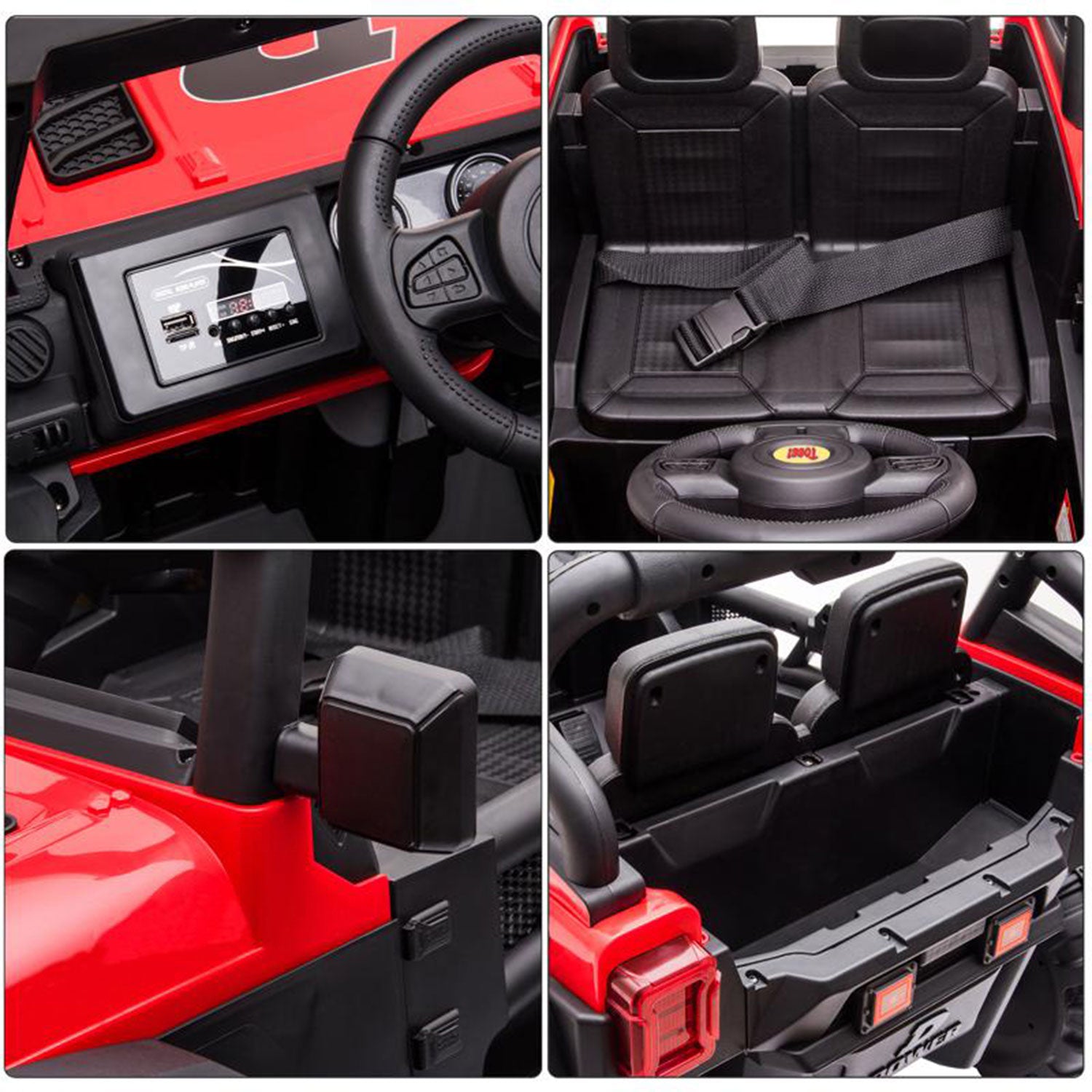 • Adjustable safety seatbelts are included, prioritizing outdoor safety