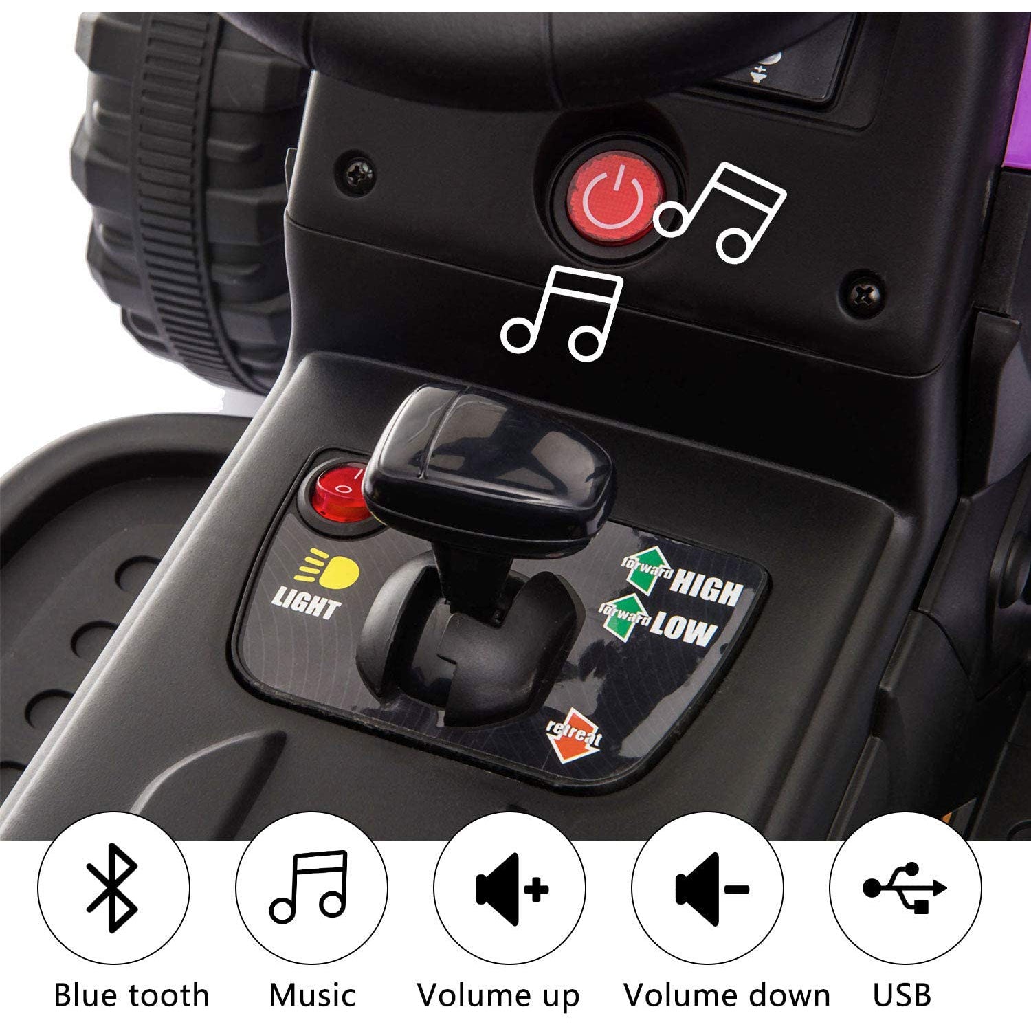 Let your toddlers experiment with noise and have fun with the included preset sounds, air horn, USB audio port, and Bluetooth connectivity. Pack your child's favorite toys into the large included trailer and send them off for a day of fun. Don't stress over any bruised knees and rely on the handrails and seat belt to keep them in place.