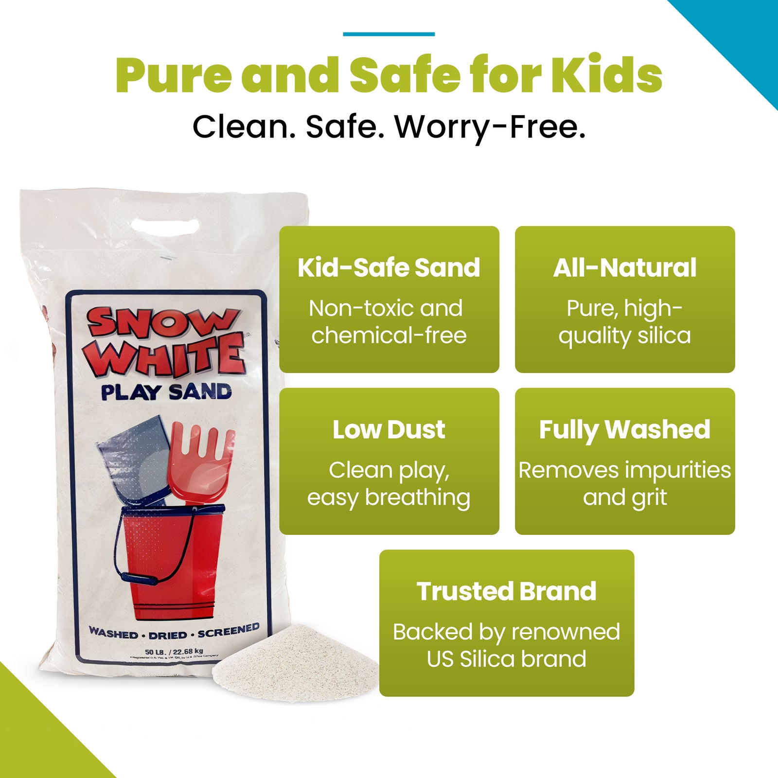 - Clean and screened to create a high-purity, fine sand that is clean, safe, and ready for your little ones to play in
