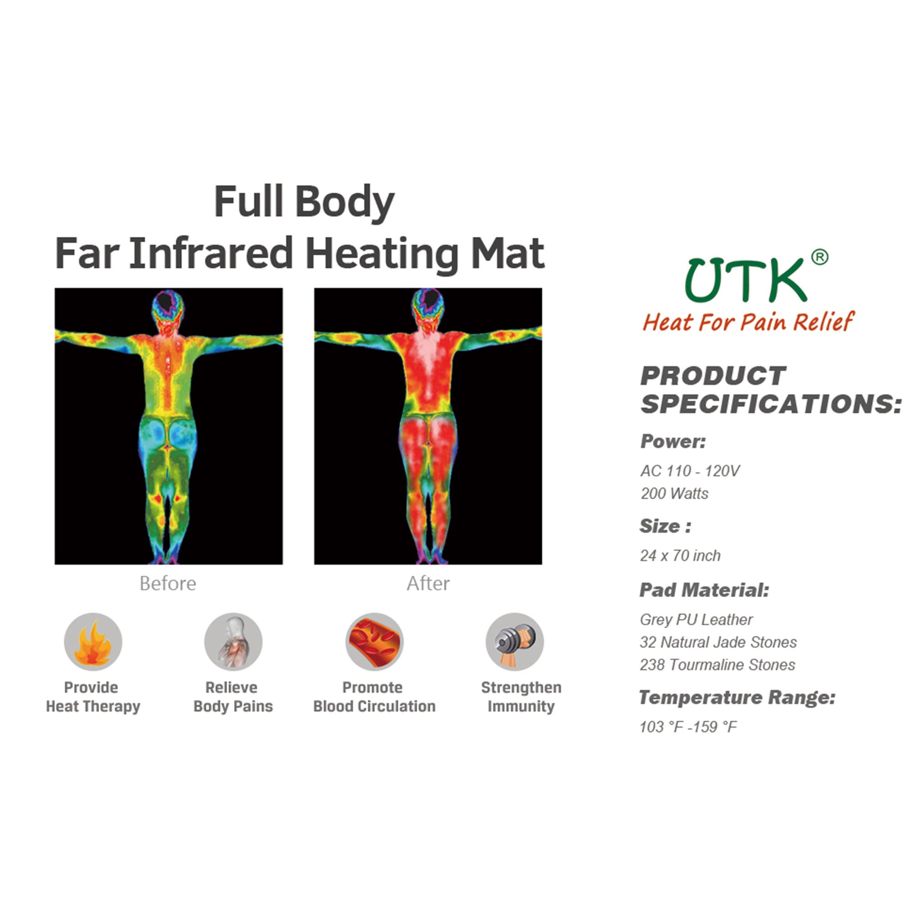 UTK 24 x 70 In Tourmaline Stone Infrared Pain Relief Heating Mat Gray (Open Box)