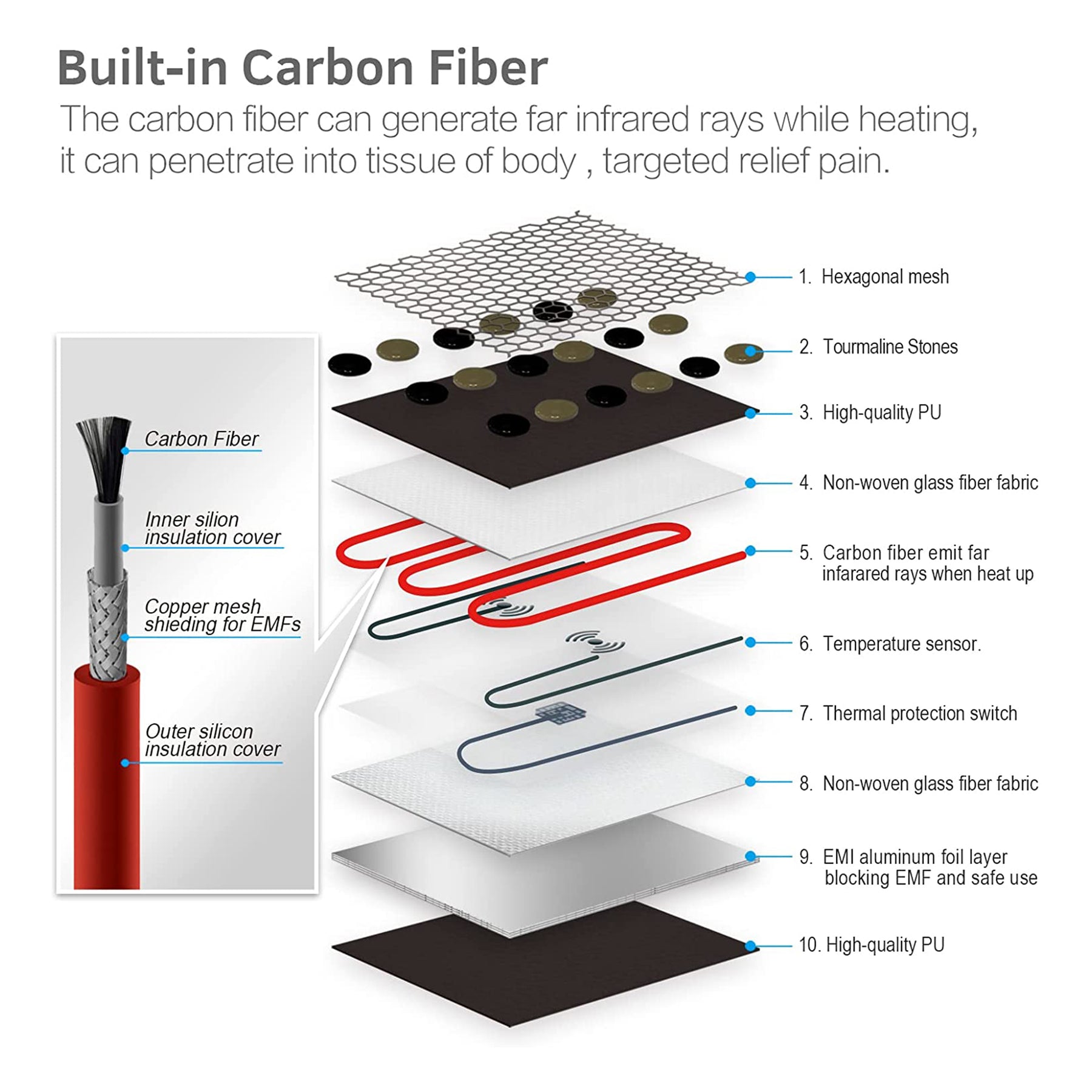 • Unique carbon fiber interior wire can emit far-infrared rays to relieve pain in your waist, back, abdomen, legs, and anywhere else you feel pain