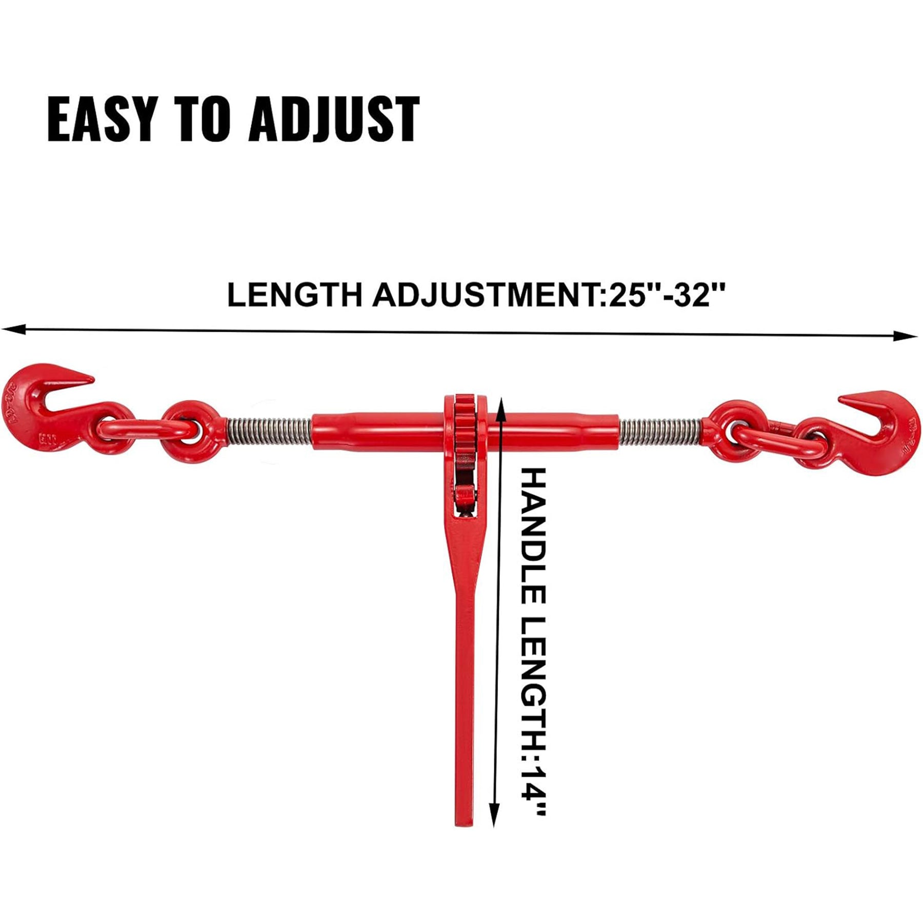 Constructed from robust G80 chain steel and 20Mn2, this heavy-duty kit can endure rigorous fieldwork and harsh climates. The vibrant red powder-coated finish ensures maximum durability and longevity, allowing your equipment to withstand the test of time. The kit features a versatile ratchet binder equipped with 2 G70 hooks, enabling seamless integration with your chains at both ends. You can manually adjust the width between the hooks from 25 inches to 32 inches, offering flexibility and precision in securing your loads. Additionally, the package includes a handy shackle, fitting 3/8-inch to 1/2-inch chains, for added convenience and versatility.