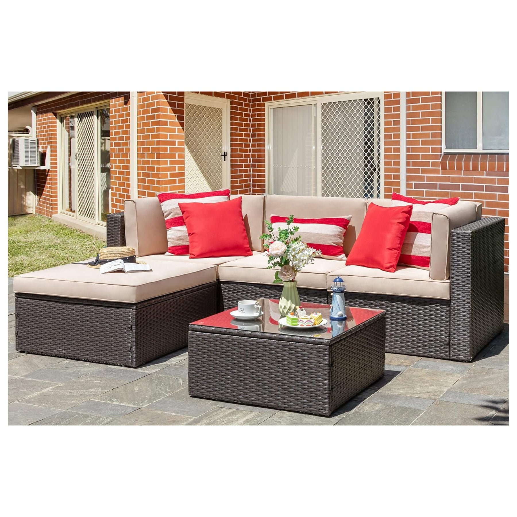 Vongrasig 5pc Patio Set, Outdoor Sofa w/Ottoman & Table, Beige (Open Box)