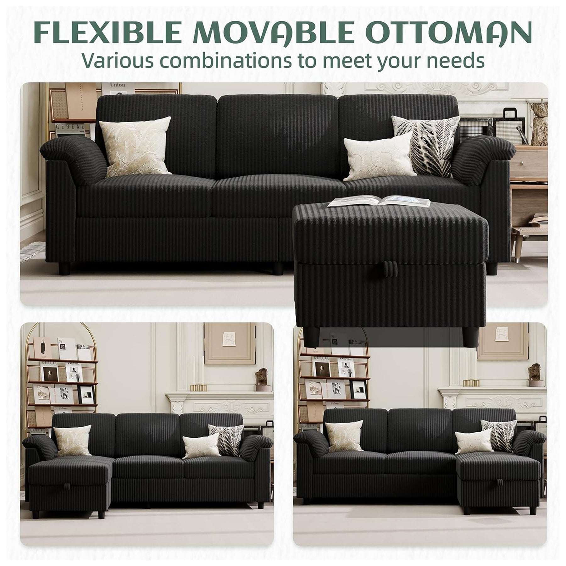 • Includes multifunctional ottoman that doubles as a footrest, coffee table, or storage space