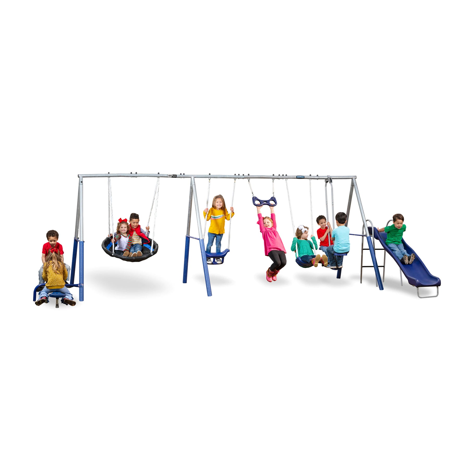• XDP Recreation Fun All-Mighty Play Swing Set has 7 play stations to allow 10 kids to play together; private home use only
