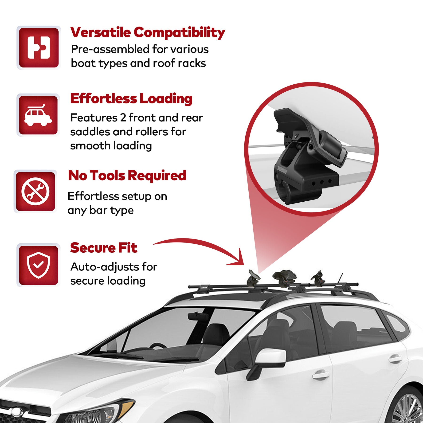 • Beyond loading, this boat loader is a fully assembled system featuring smooth molded pads, tilting paddle technology, and heavy-duty straps, catering to various boat types and roof rack systems
